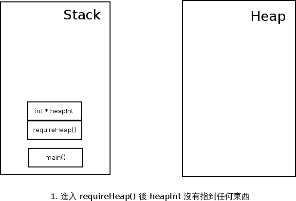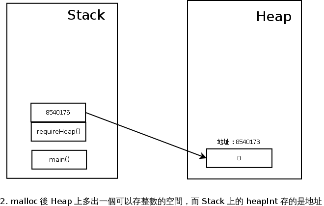 上面的程式碼進行的事情很簡單,我們在 requireHeap 裡用 malloc 向程式語言 runtime 要了一塊大小為 sizeof(int) 的記憶體,也就是一塊大小可以存放一個整數的記憶體空間,這個時候 malloc 會回傳一個 pointer 給我們,因為我們已經知道我們要存的是整數,所以我們用 (int *) 將回傳來的 pointer 強制轉型成為指到整數資料的 pointer。