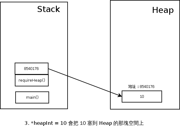 - 要操作 Heap 上的資料,靠的是指到該 Heap 的記憶體位置的指標