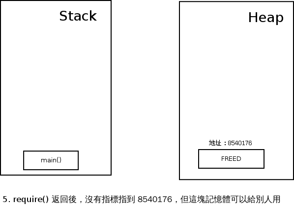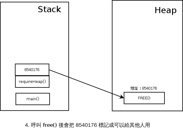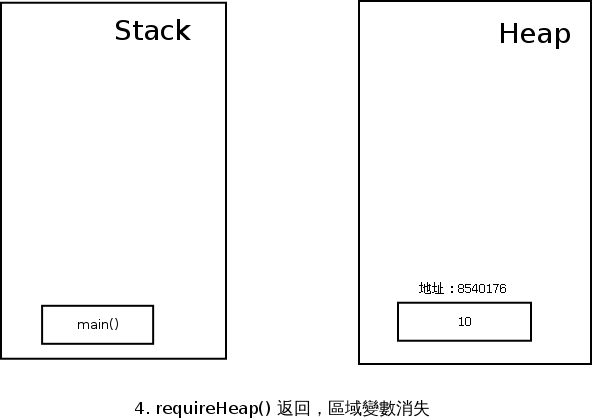 沒錯,在第四張圖裡面,我們的 requireHeap() 函式返回之後,用來指到程式語言 runtime 給我們的記憶體用的 heapInt 變數已經消失了,但是記憶體位址 8540176 的地方還存著一個整數 10,但卻沒有人可以用到那塊記憶體!
