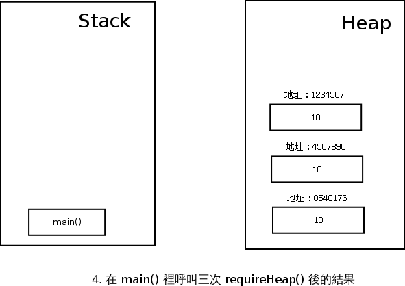 接著我們試著把這種個程式的 Call stack 畫出來看看……記得 Stack 和 Heap 是不同的東西,所以要分開來畫喔。