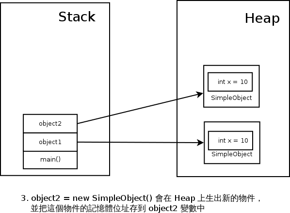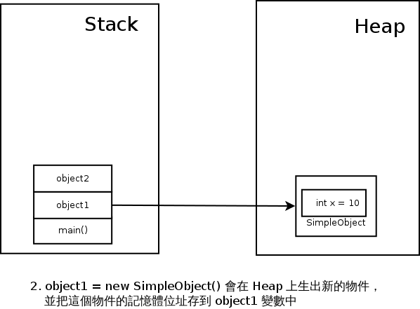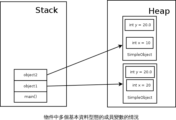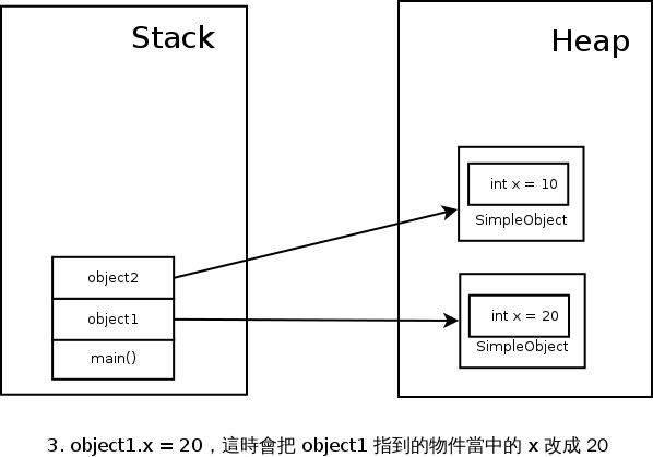 換句話說,你也可以把 object1.x 記成像「找出 object1 裡存的地址所指到的 Heap 空間當中的 x」這樣的意思。