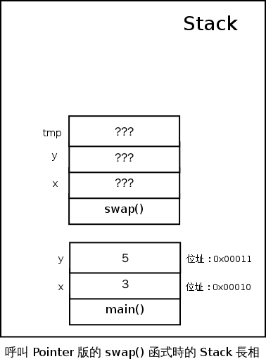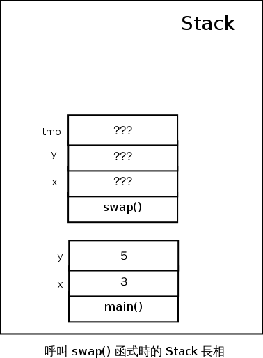 現在問題來了,當我們在 main() 裡面呼叫 swap(x, y); 的時候,一開始到底發生了什麼事,Stack 上屬於 swap() 函式的 x 和 y 又會是什麼呢?
