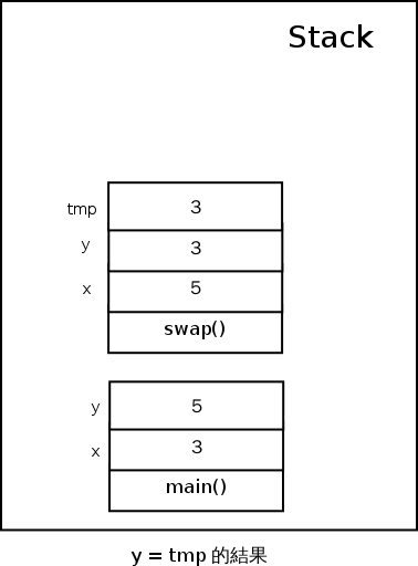 之後的 y = tmp 則會把 swap() 上的 tmp 的值複製到 swap() 上的 y 當中: