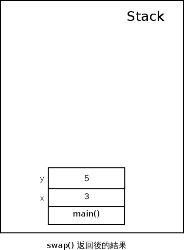 最後,當 swap() 函式返回之後,Call Stack 上配置給 swap() 函式的空間就被消滅了,所以現在 Call Stack 上只剩下 main() 函式裡的 x 和 y 變數了,而且他們從頭到尾都沒被動過: