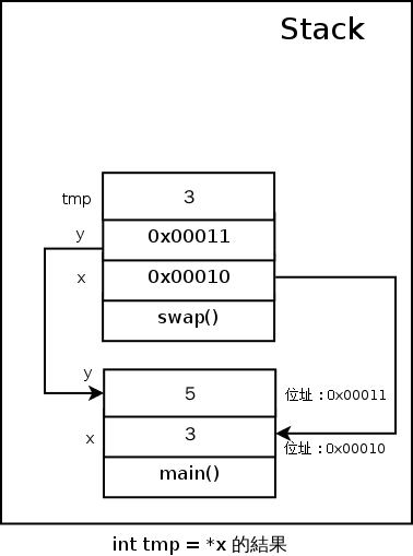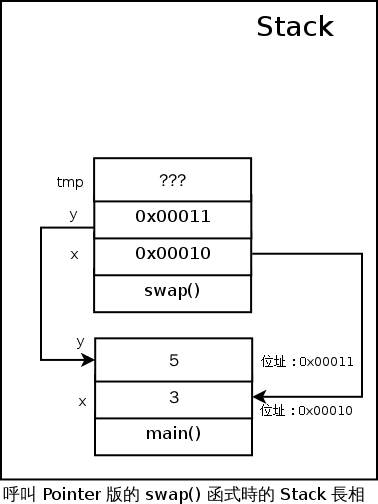 現在,你應該知道為什麼這樣的 swap() 函式並不能做兩個數字的交換了吧?因為你改到的,都是在 Stack 上屬於 swap() 的變數,而不是 main() 裡面的變數。
