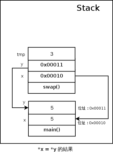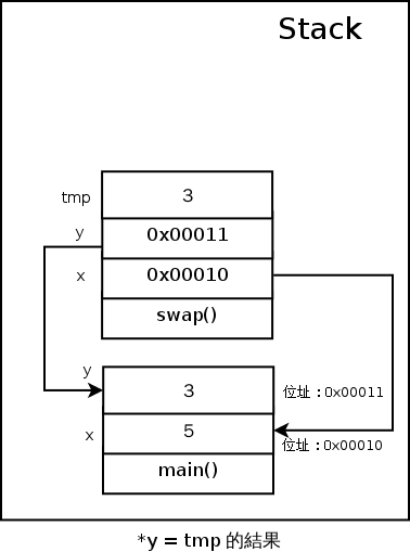 最後的 *y = tmp 則會把 y 這個 Pointer 指到的記憶體內容,改成 swap() 上面的 tmp 的值,所以變成這樣: