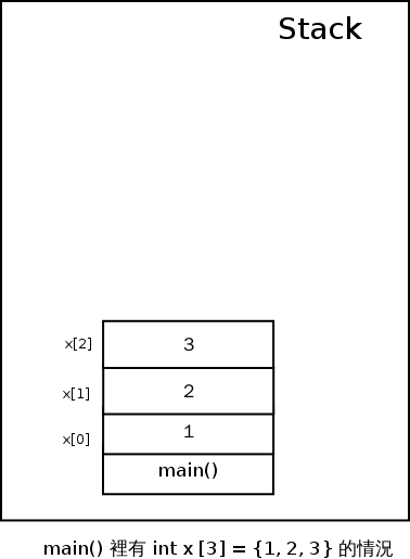 但問題來了--這個 x 在記憶體裡到底是什麼東西呢?這個問題如果你去翻教科書,標準的答案就是「一塊可以存下 3 個整數的連續記憶體空間」,同樣的,既然這個陣列是被宣告在 main() 函式裡,那他就會存放在 Stack 上配置給 main() 的空間。