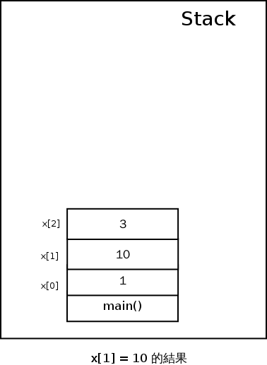 接著 x[1] = 10 會把 10 放到陣列的第二個位置,所以印出來會是 x[1] is 10,而現在 Stack 上則長得像下面一樣: