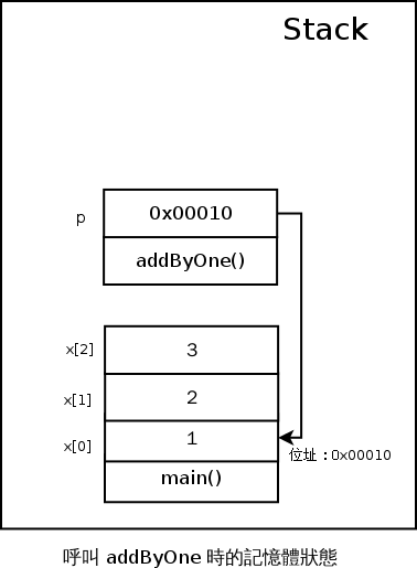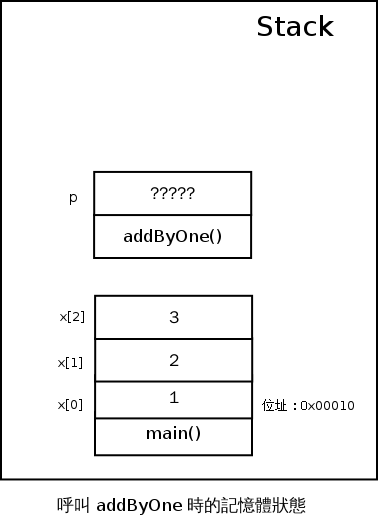 還記得我們強調過 C 語言只有 Call By Value 嗎?所以事實上 p 和其他所有函式的參數一樣,被存在 addByOne 這個函式被分配到的 Stack 空間上,所以當我們呼叫 addByOne 的時候,記憶體會長得像這樣子:
