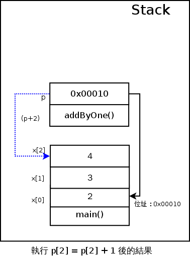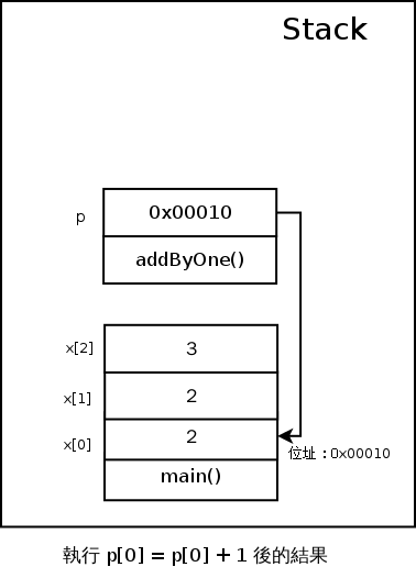 接著進到 addByOne 函式裡面,我們已經知道 p[0] 實際上的翻譯就是 *(p+0),所以是更改 p 所指到的記憶體位置的內容,所以會變成這樣: