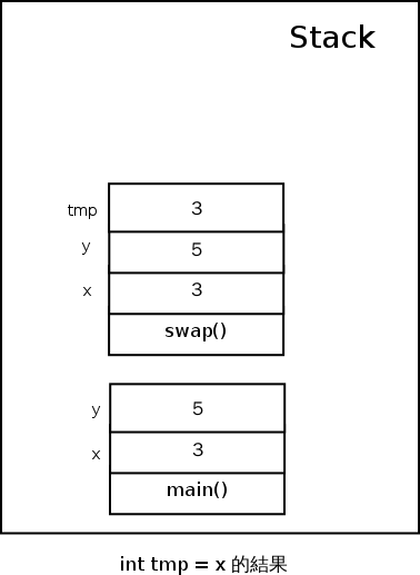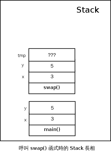 因為如果我們再次把整個執行過程的記憶體裡 Stack 的狀態畫出來的話,會發現他和 C 語言版的 swap() 一模一樣: