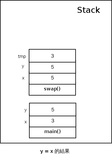 沒錯!在呼叫 swap(x, y) 的時候,會把 main() 裡的 x 和 y 所存的記憶體地址,複製一份到 swap() 上的 x 和 y 當中,所以現在我們知道當進入 swap() 函式的時候,記憶體狀態如下所示: