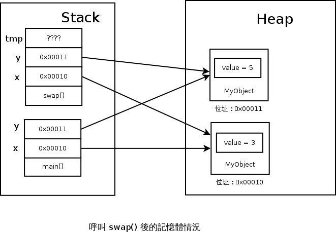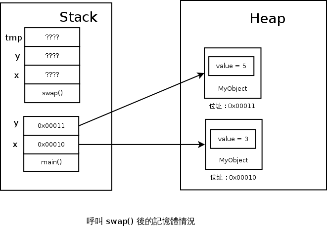 接著,我們一樣要思考的是 swap(MyObject x, MyObject y) 裡的 x 和 y 是什麼,又放在哪裡?