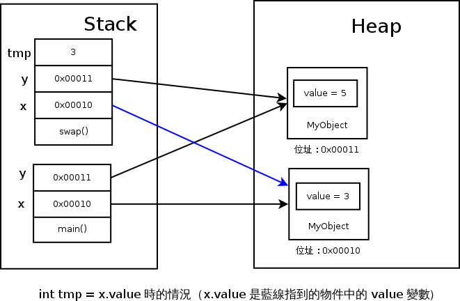 之後的 y.value = tmp 再把 swap() 上的 tmp 指定給 swap() 上的 y 所指到的物件當中的 value 成員變數: