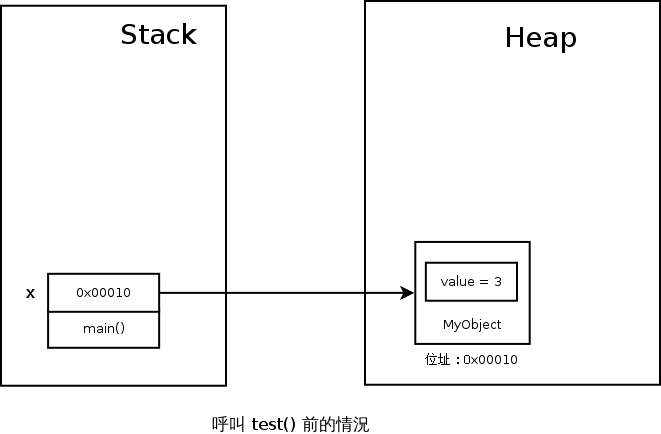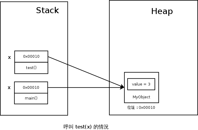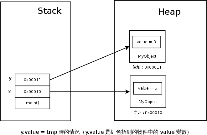 現在的你應該已經可以很容易回答出來了--在 Stack 上的 main() 裡面,有著 x 和 y 兩個變數,存的是 Heap 上的兩個 MyObject 物件所在的記憶體地址,所以可以畫出像下面的圖: