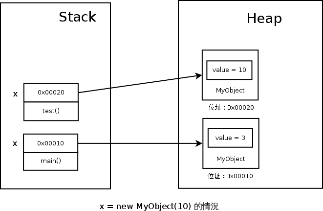 同樣的,要回答這個問題的關鍵,是 x = new MyObject(10) 這行,到底在記憶體裡動了什麼手腳。