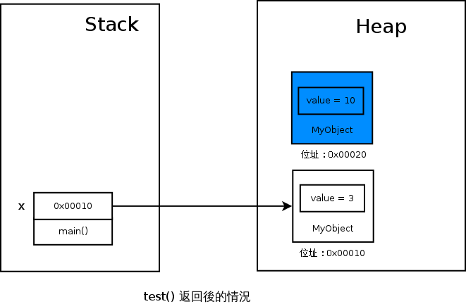 同時你也應該會發現,這樣子做的話,實際上會在 Heap 上產生一個垃圾物件,因為只要你一離開了 test() 函式,就沒有人可以尋著任何 Reference 拿到你在 test() 裡 new 出來的 MyObject 囉。