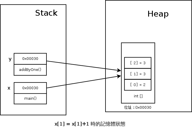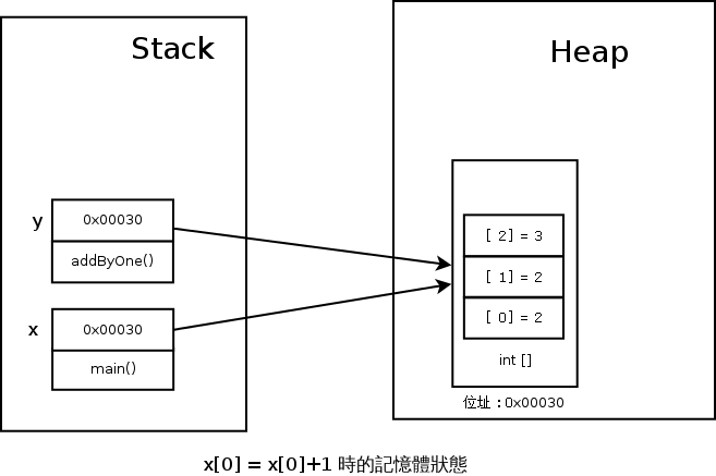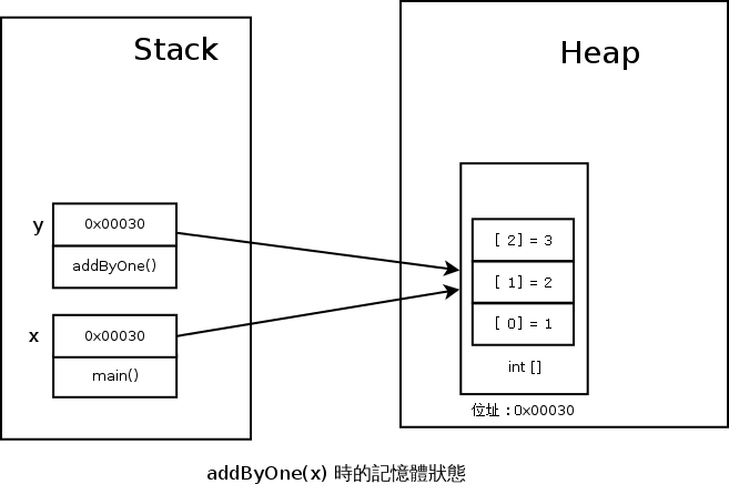 現在的我們,已經知道 x 和 y 既然不是那八個 primitive type,那他們就一定是存放記憶體地址的 Reference,再加上我們也知道 Java 只有 Call By Value,所以這兩個變數一定是放在 Stack 上!