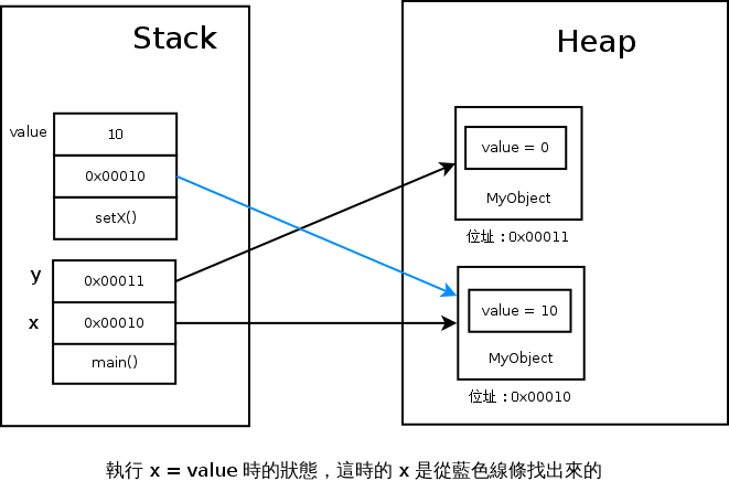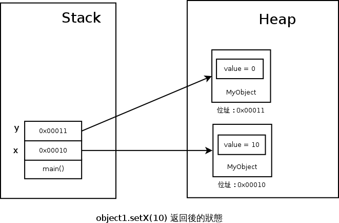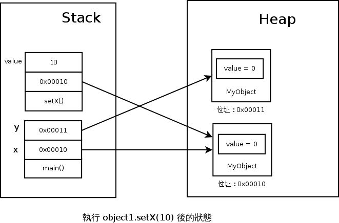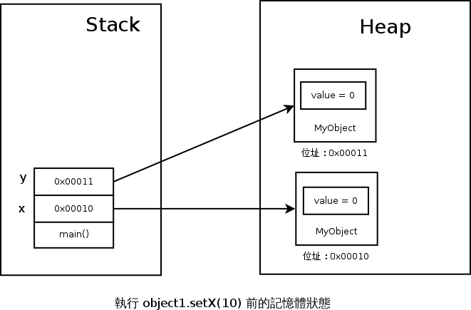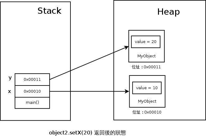 而接著執行 object2.setX(20) 時也是同樣的流程,但是一開始我們複製的是 main() 裡的 y 所存的記憶體地址: